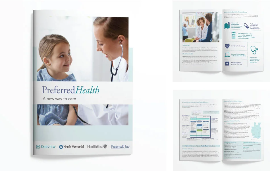 PreferredOne teamed up with Fairview, North Memorial and HealthEast creating a new health plan called PreferredHealth. PreferredHealth is the largest accountable care organization (ACO) network in Minnesota. Pieces for this product included branding, member pieces, B2B pieces and an online presence.